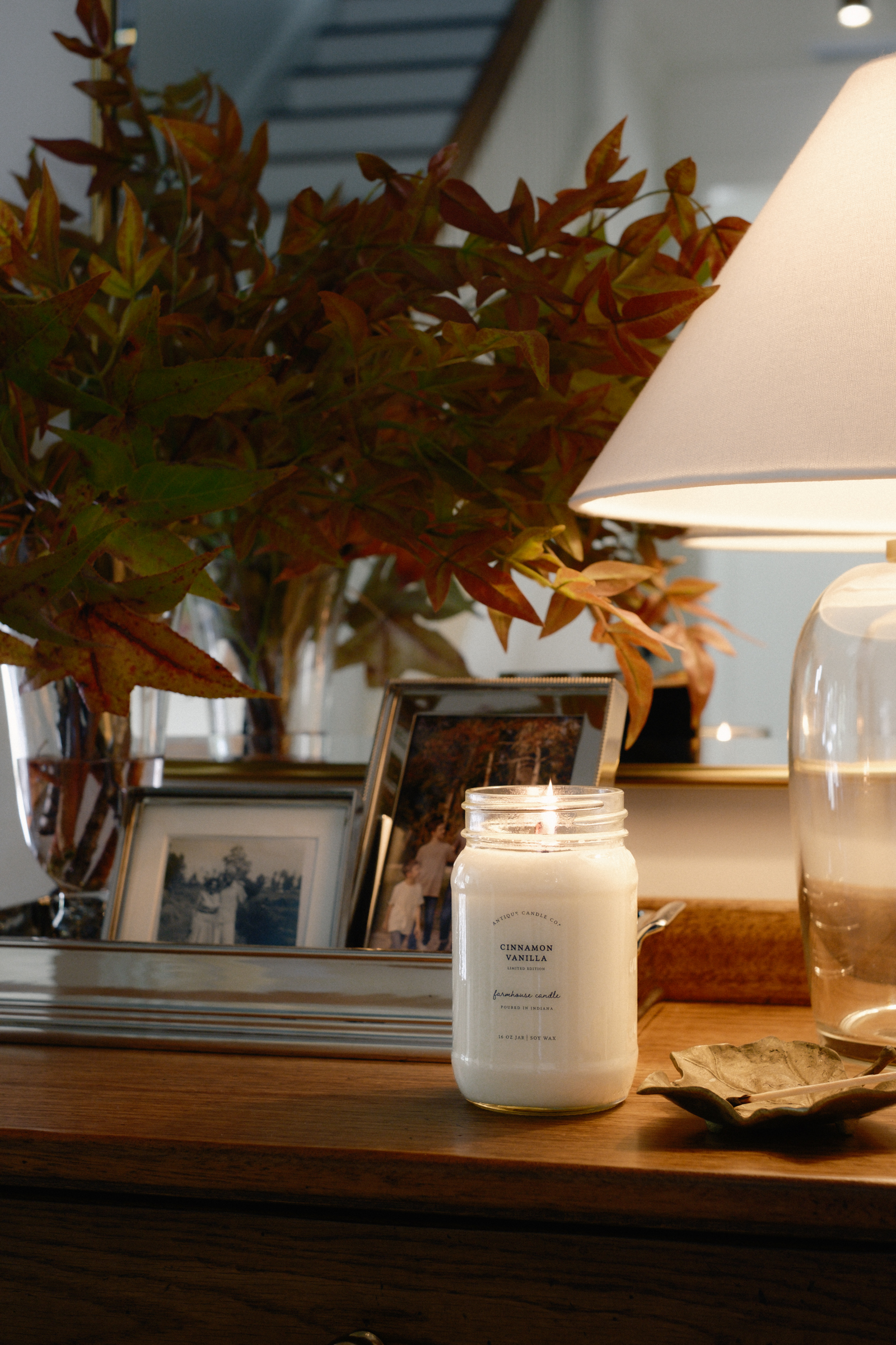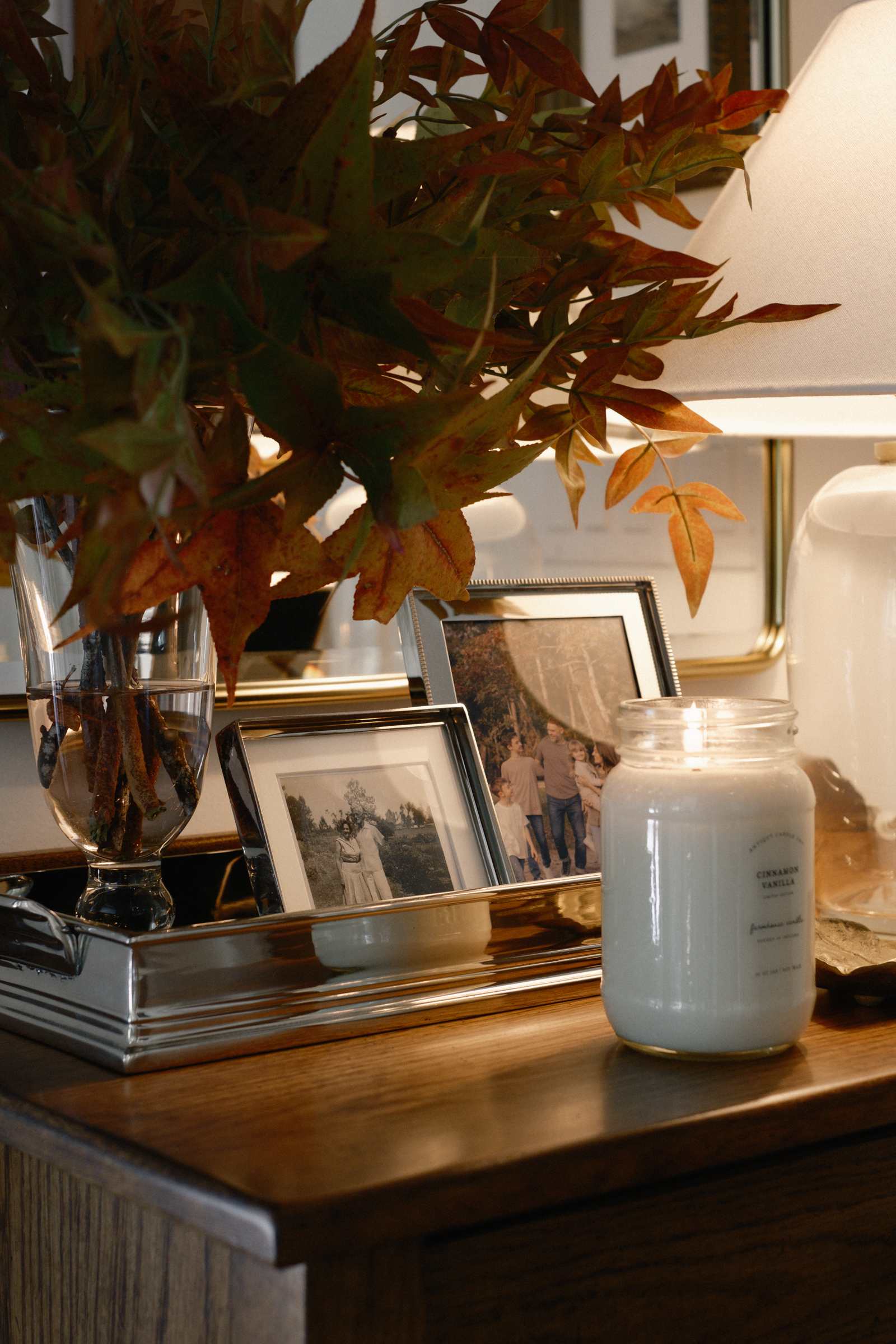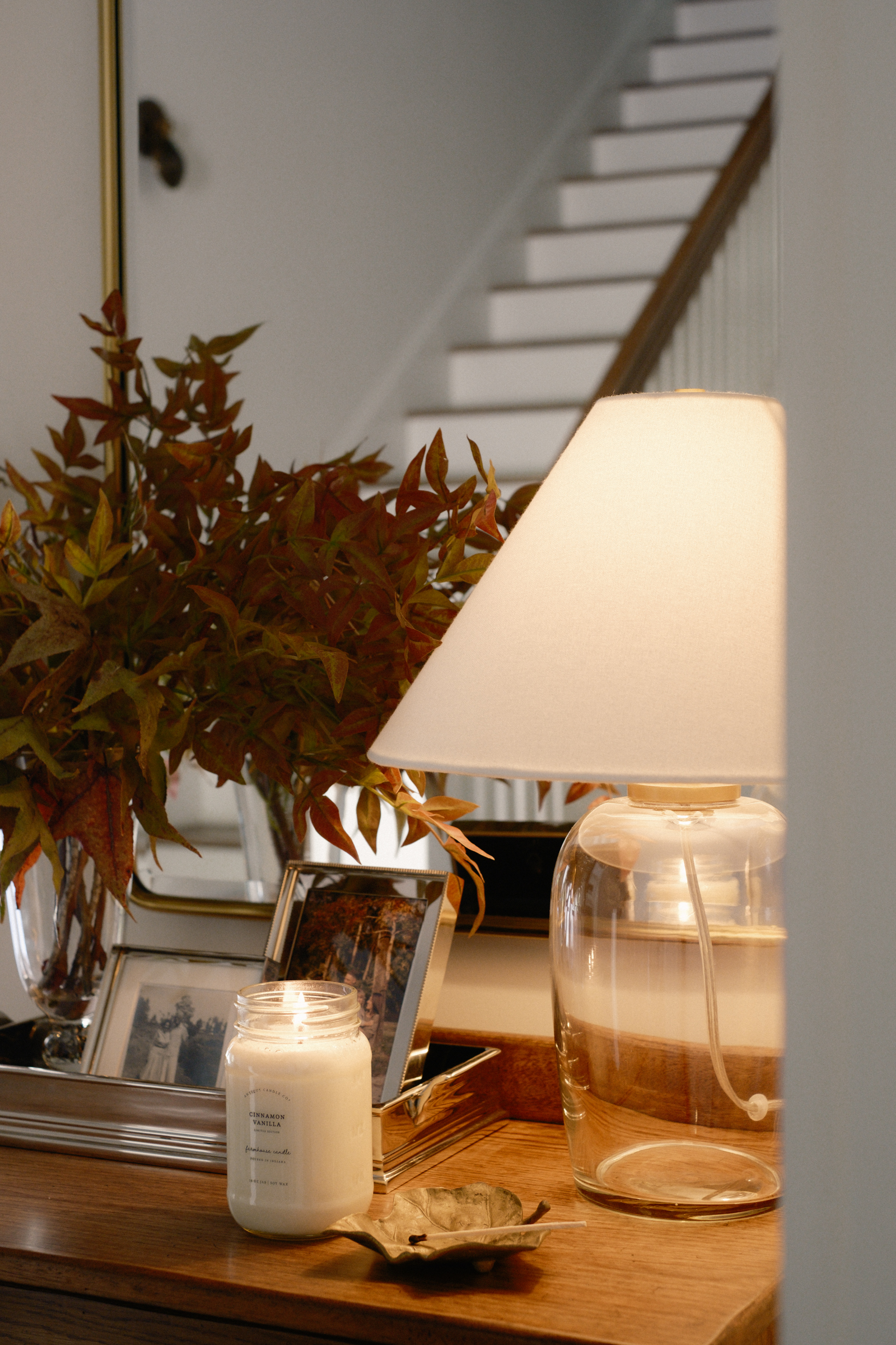 Even though I have more than 3 items on the surface of this entry cabinet, I essentially styled it in 3 groups- First, the tray corrals all of the items together making it feel cohesive instead of cluttered. The lamp acts as it’s own group, and the last group is a seasonal scent and leaf object to hold the used match.
