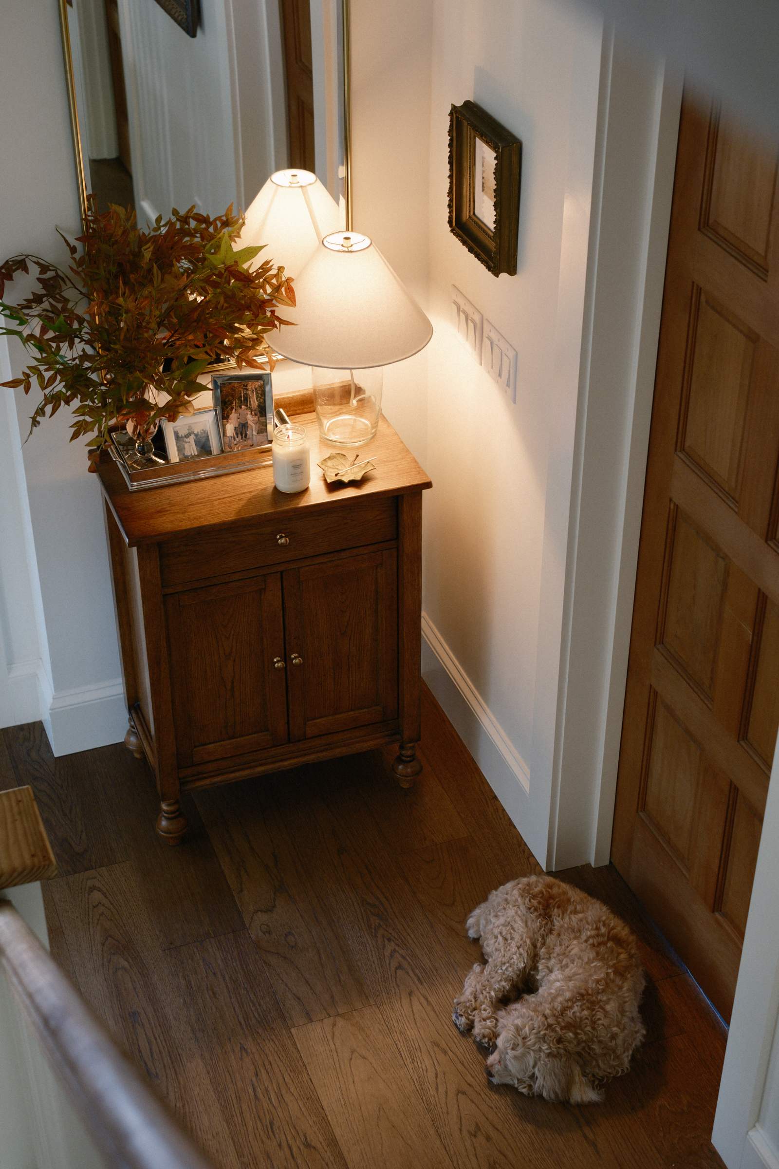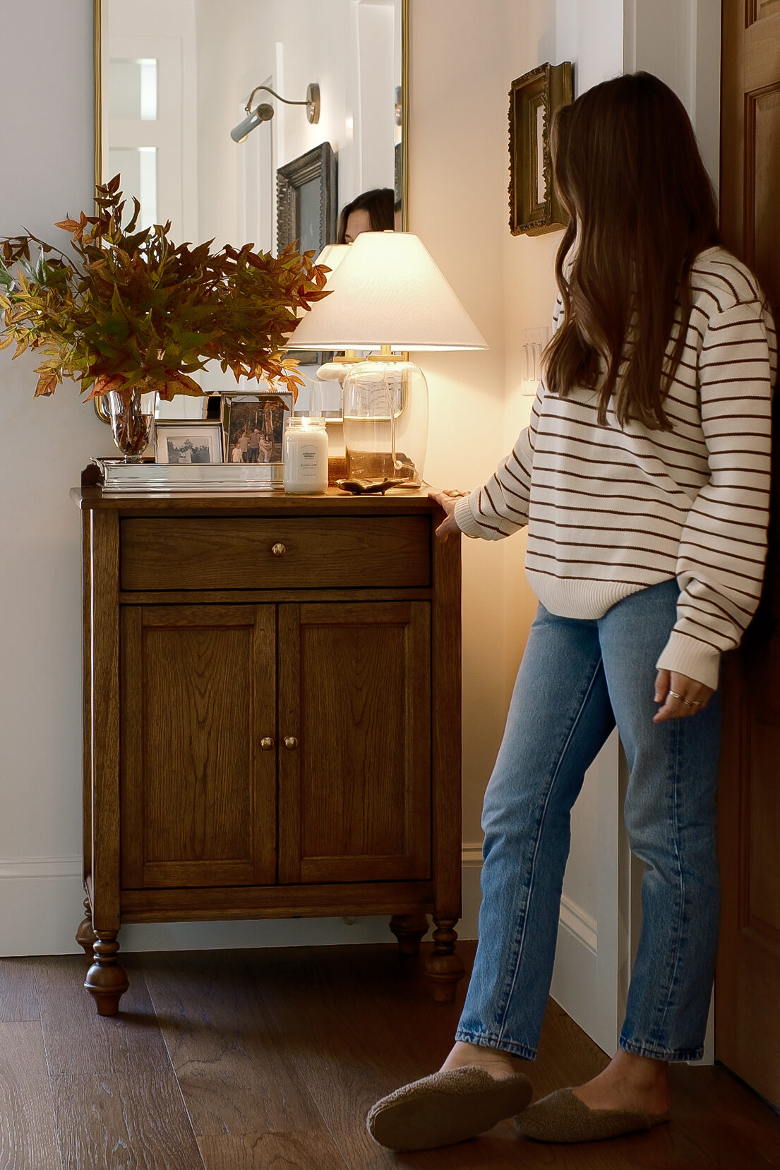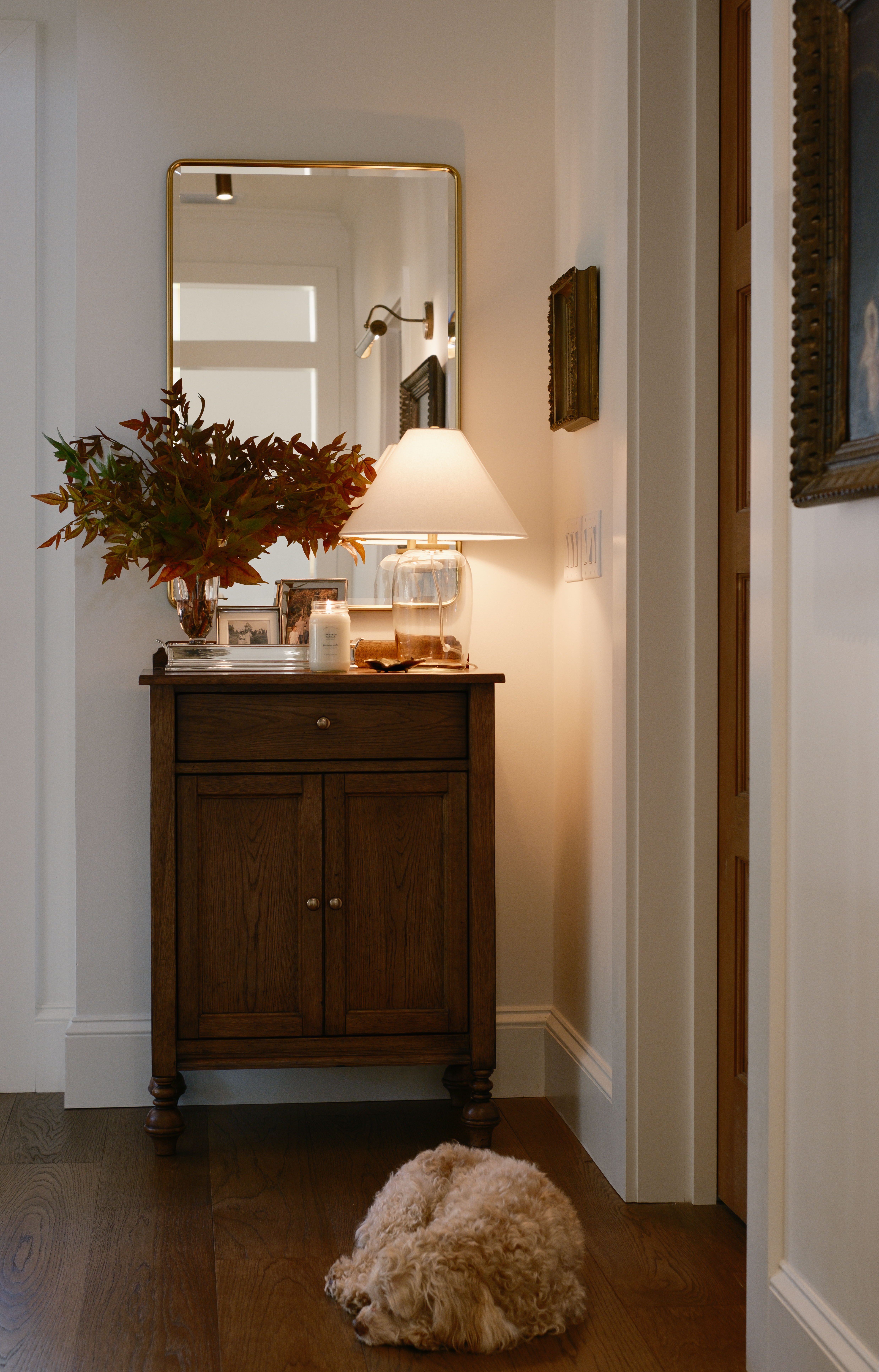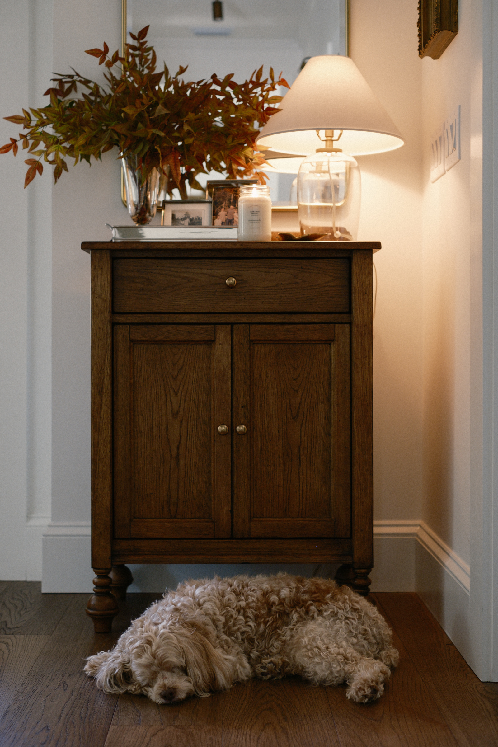 Even though I have more than 3 items on the surface of this entry cabinet, I essentially styled it in 3 groups- First, the tray corrals all of the items together making it feel cohesive instead of cluttered. The lamp acts as it’s own group, and the last group is a seasonal scent and leaf object to hold the used match.