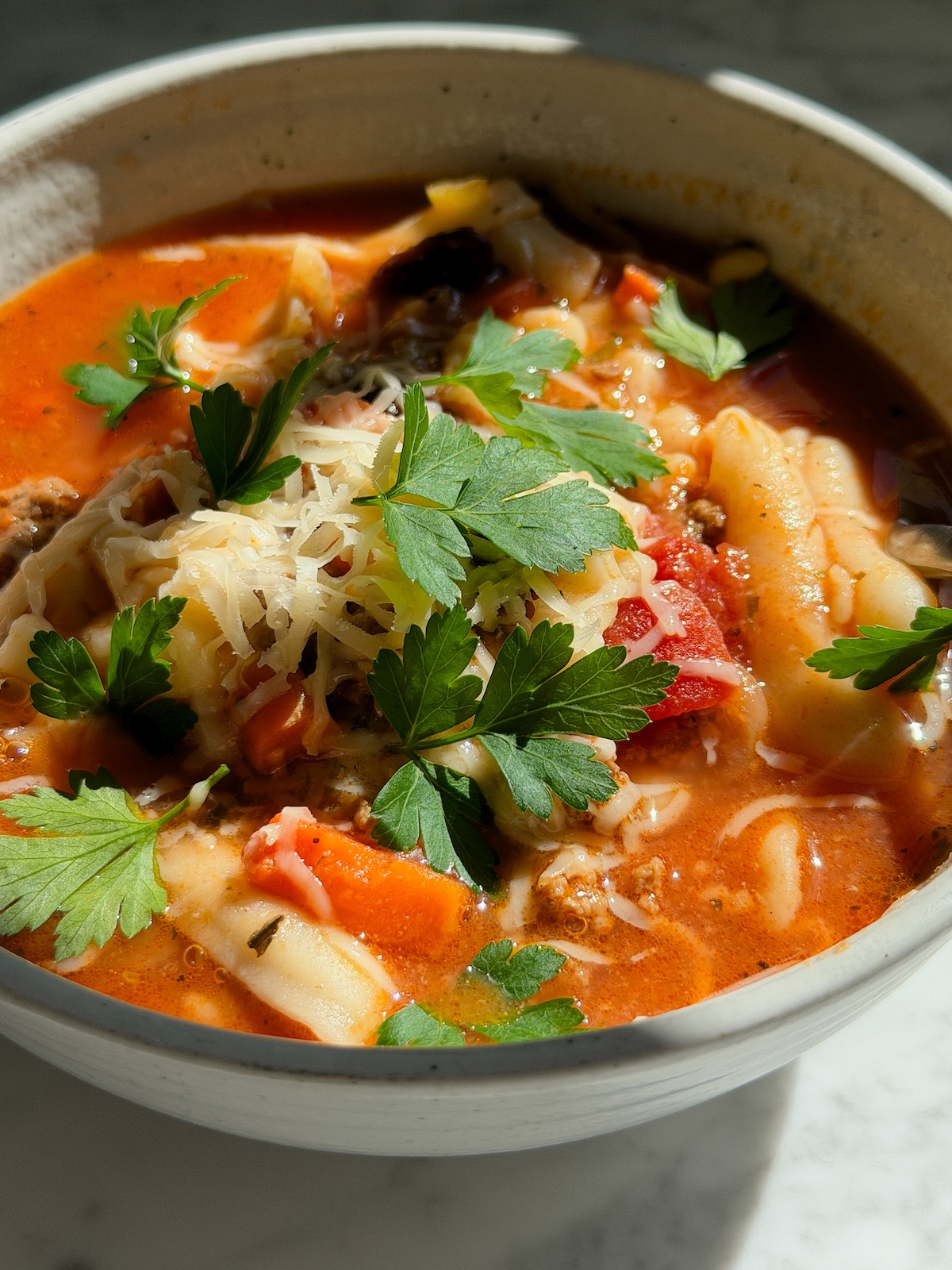 - Ladle the soup into bowls and garnish with freshly shaved Parmesan and fresh Parsley.