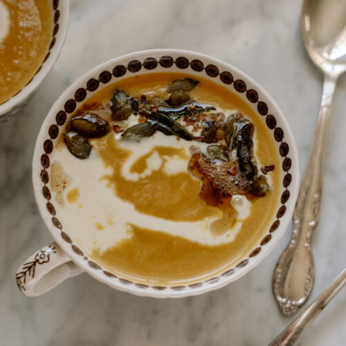 In a separate pan, brown 4 tbsp of butter. Add in fresh sage leaves and cook until leaves are crispy. Remove the leaves from the butter and pour the soup into bowls or little cups. Garnish the individual soup bowls/cups with a drizzle of whipping cream, a tsp of browned butter, a couple of crispy sage leaves, a few roasted pumpkin seeds and more red pepper flakes (if you want the added heat).