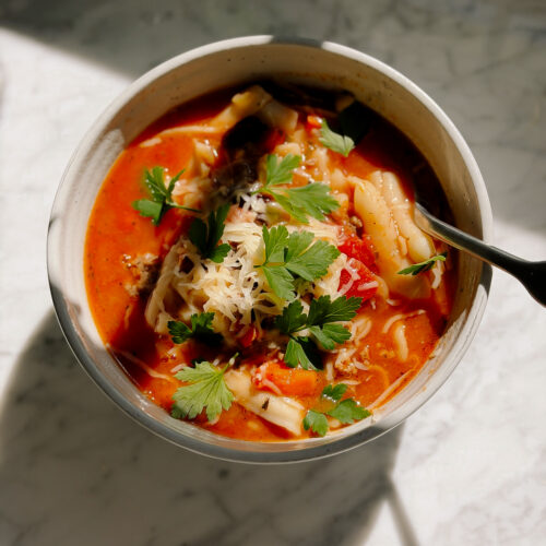 Ladle the soup into bowls and garnish with freshly shaved Parmesan and fresh Parsley.
